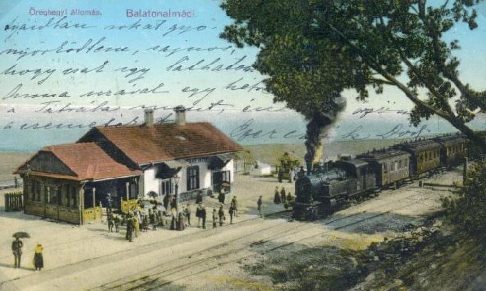 A Győr-Veszprém-Alsóőrs vasútvonal 1906-ban történt tervezése sok érdek által ütköztetett, hosszas viták során alakult. Végül Almádiban a domboldalon vezették a síneket, a mai Töltés, Vécsey, Szabadság-kilátó utcák vonalában. Itt fent volt az igen szép kilátással bíró vasútállomás. Az 1908-ra elkészült vonalat - gazdaságtalanságra hivatkozva - 1968-69-ben szüntették meg.