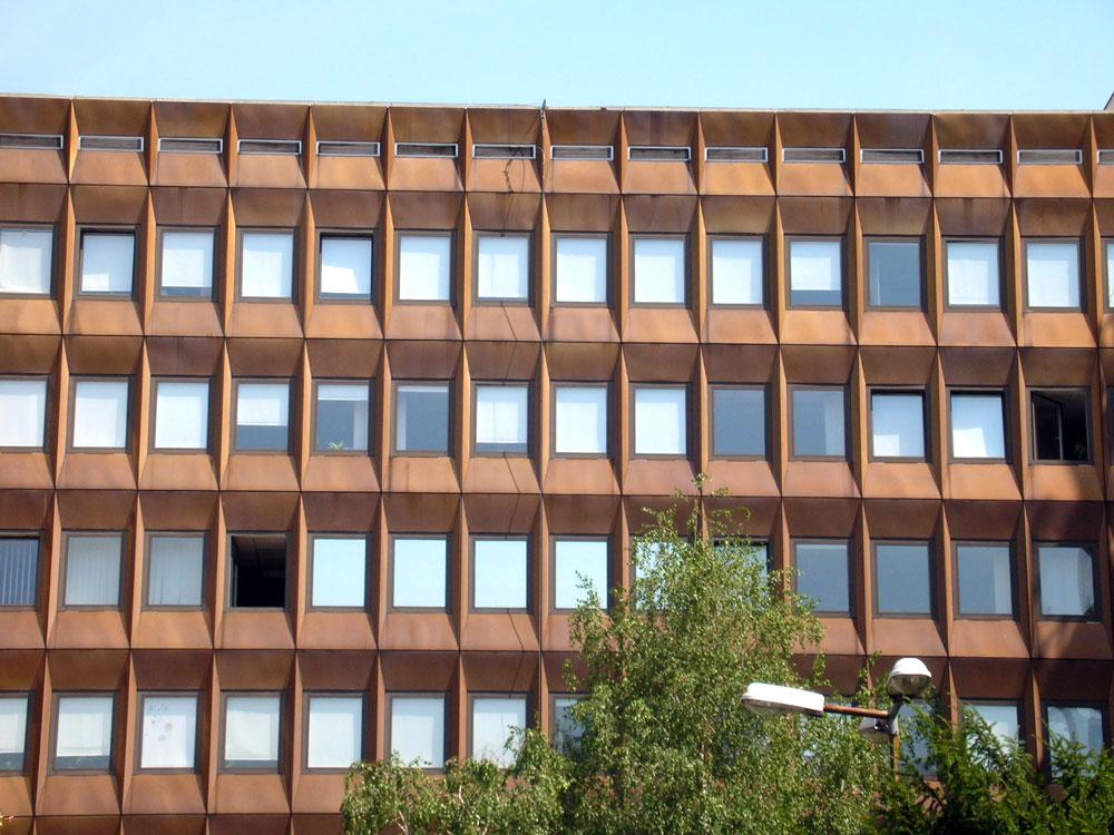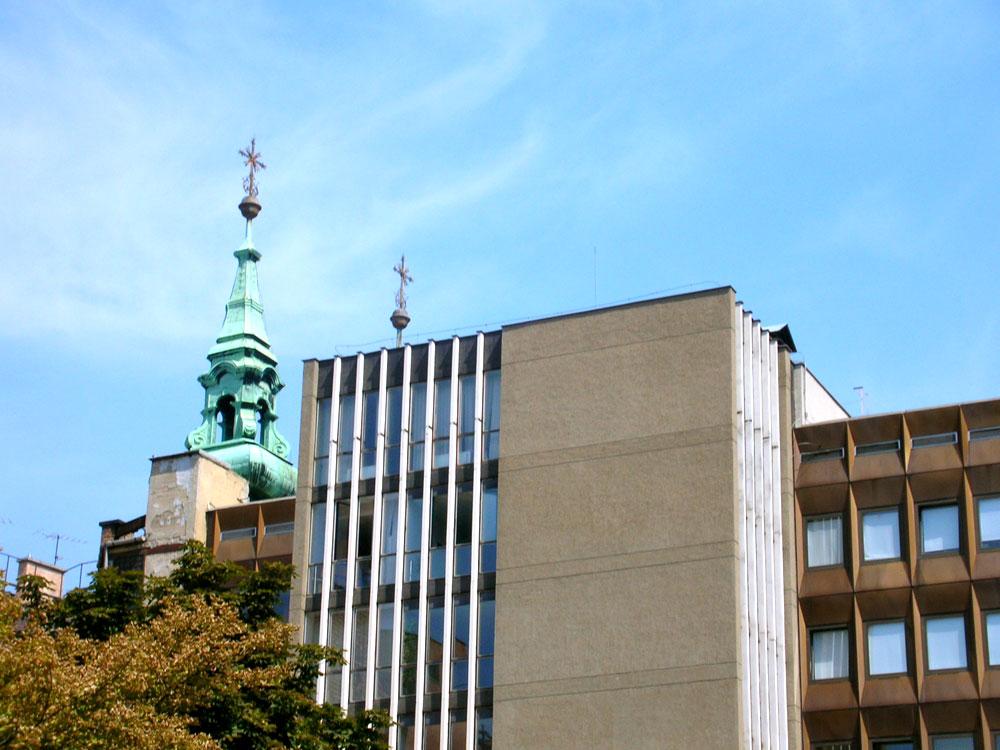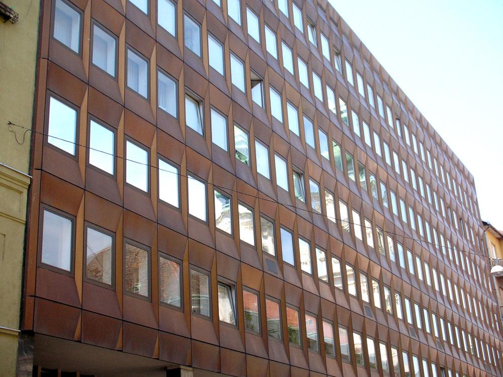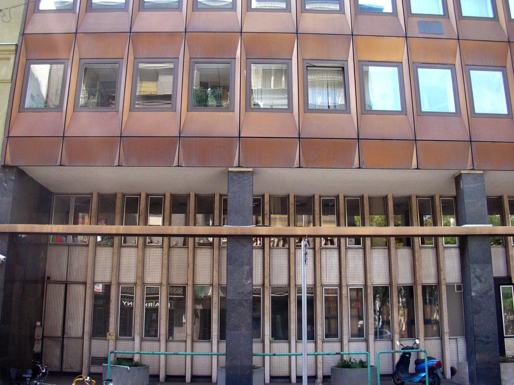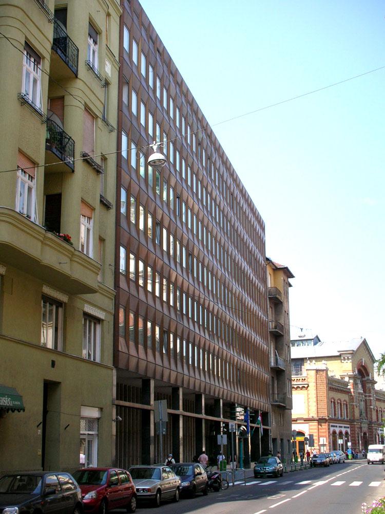 "...Az OVH (Környezetvédelmi Minisztérium) is telekösszevonások eredményeként kialakult nagyobb területre épült. Az Iskola utcai oldalon gépkocsi parkoló készült. A hivatal a környezet adta léptéket, arányokat, anyagokat megtalálva gazdagítja egy mai hangvételű épülettel a Fő utca különleges világát. Függönyfalának szép arányú tagolása, bronzos felülete szépen simul környezetének barokkos hangulatába. Ezt a hatást a homlokzatképzés különleges megoldása biztosítja. A sima, nagy üvegfelületű panelek helyett alumíniumból oly elemek kialakítására került sor, amelyek domborítása különböző fénytörések révén érdekes homlokzati megjelenést mutatnak. Ezzel a tagolással az épület mai hangvételű lett, korunk egyik legjobb középülete és jól illeszkedik a belső városképbe. Az épület viszonylag nagy tömegével sem lépi túl környezetének léptékét, s így a Várhegyről nézve a külső városképet sem bontja meg..." F: Clevené Harrach Erzsébet: A városrendezés és városkép alakulása Budapesten 1945-1975 között.