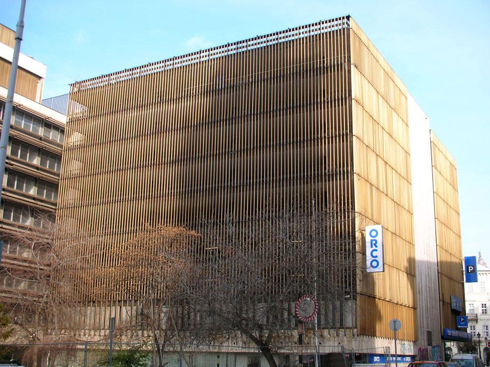 Az L alakú irodaházi szárny magasságát tanácsi rendelet szabta meg; a tervezők a felső két szint hátrahúzásával enyhítettek a túlzott méreteken. (A tervezett Hadid-házzal épp ellenkezőleg lesz: itt a tervtanács kérésére visszavettek a magasságból.) Fokozott figyelmet fordítottak az épület mögött húzódó Fehérhajó utca benapoztatására is; ezért lépcsőződik vissza az épület Petőfi Sándor utcára néző homlokzata. Ez az eredeti tervek szerint lábakon állt volna, a tágasabb járdák érdekében. Az L-alakú alaprajzzal és a tömegformálással sikerült elérni, hogy a tér valamivel nagyobb lett, mint a háború előtt. A két különböző funkciójú szárny, a magasgarázs és az irodaház egységes megjelenését a mészkő- és alumíniumburkolat hivatott biztosítani. A rövid határidők miatt a földszint feletti épületrészek francia Outi-Nord zsaluzási technikával készültek, ami nemcsak kötött, cellás alaprajzi rendszert eredményezett, de az egységes felületet képező falak és födémek megváltoztathatatlanságát is. Az épület így a mai irodaházi igényeknek egyáltalán nem felel meg. A mélygarázsépítés fejlődésével a parkolóházak is atavisztikussá váltak.....