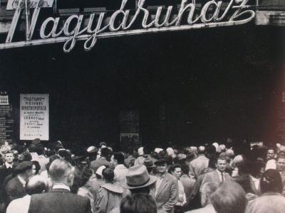 Az áruház Budapest ostromakor kiégett, de a háború után csak a legszükségesebb javításokat végezték el az épületen, a művészi szempontok teljes mellőzésével. Mivel az átfogó felújítás elmaradt, illetve 1956-ban az áruház újabb sérüléseket szenvedett, az 1960-as évekre az épület életveszélyessé vált, ezért a teljes körű felújítás nem várhatott tovább. Sajnos nem az eredeti állapot helyreállítása mellett döntöttek, hanem úgynevezett lux-flex borítást kapott az épület, így a két neves művész által készített homlokzati díszek már nem láthatók.