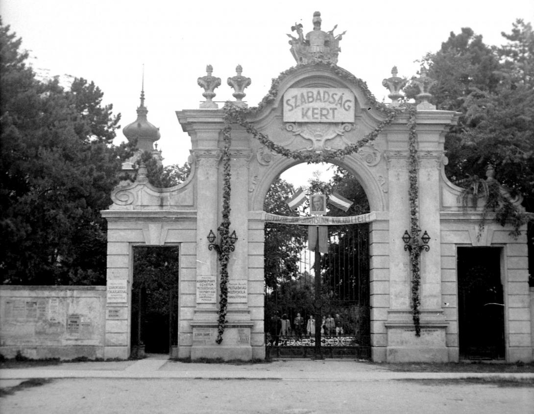 Az 1952-es képen már a Magyar Agrártudományi Egyetem táblája látható. Fent Rákosi kép, alatta a szöveg: "Üdvözöljük járásunk küldötteit".